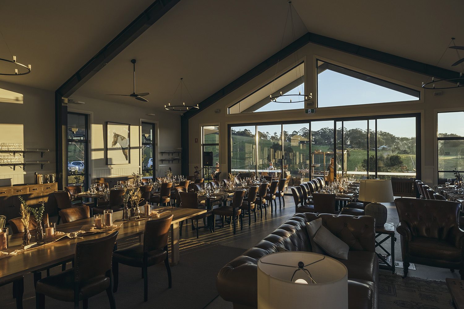 The Paddock restaurant is the heart and soul of the estate, with heavy, sliding barn doors creating a dramatic entrance. Once inside, the scale of the space plays a key part in the design, with your attention immediately drawn to the country landscape outside.